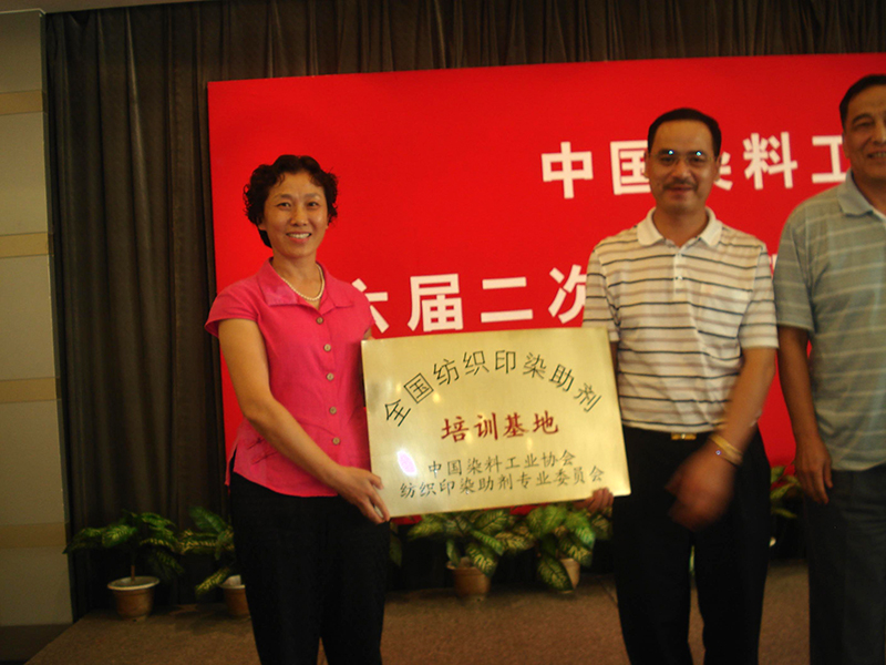 阮加春總經(jīng)理代表中國染料協(xié)會理事會頒發(fā)“全國紡織染料助劑培訓(xùn)基地”牌匾。