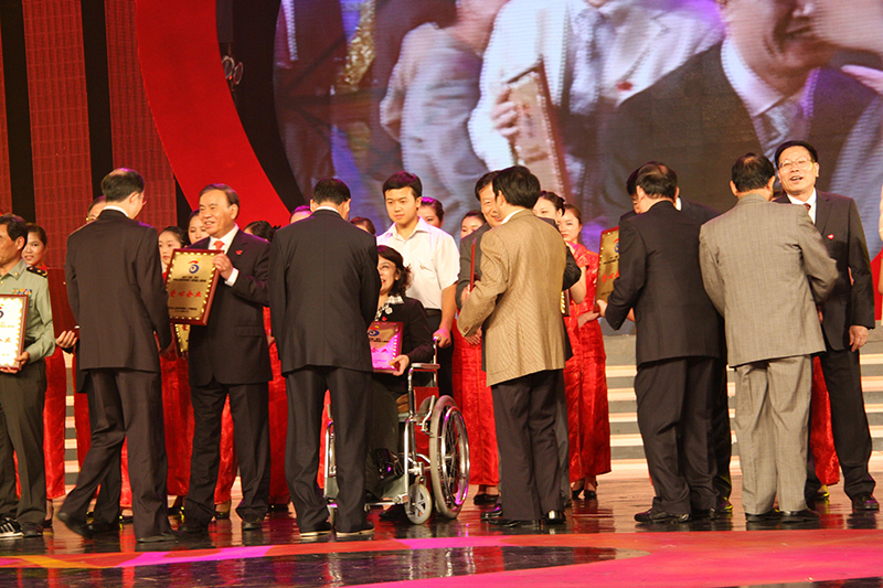 10月11日,阮加春總經(jīng)理在第八屆全國殘運(yùn)會倒計(jì)時(shí)一周年大型愛心助殘晚會上接受中國殘聯(lián)主席張海迪(坐輪椅者)頒發(fā)“愛心企業(yè)”獎(jiǎng)牌。浙江省省長呂祖善等領(lǐng)導(dǎo)出席了本次活動。